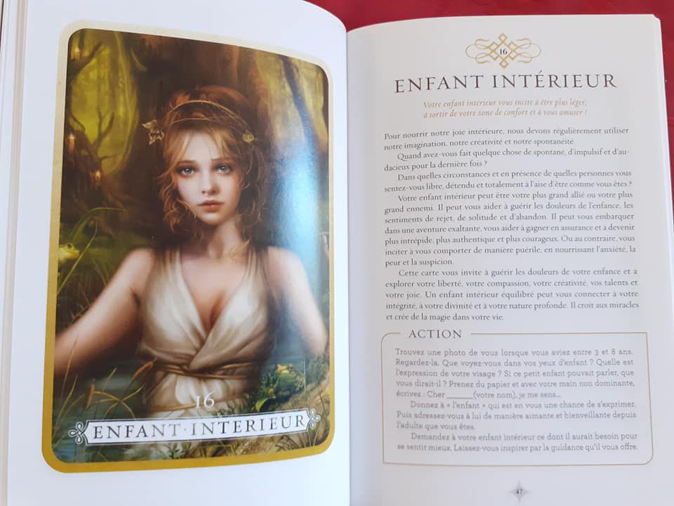 Cet oracle est fourni avec un carnet de 93 pages, mais je préfère m'en servir que dans les actions que l'auteure propose de mettre en place et de plutôt lire les cartes de façon plus intuitive. Les dessins sont superbes et pour chaque tirages j'y vois de nouvelles choses dans chacune des illustrations. Selon la problématique et la personne en face de moi, les cartes ne résonnent pas de la même manière.
